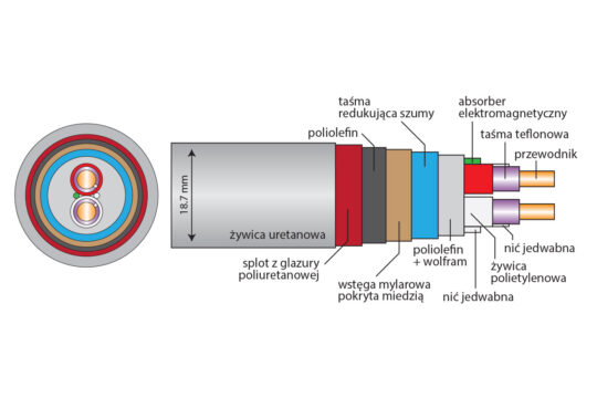 - Ekranowanie: wstęga mylarowa pokryta miedzią, taśma redukująca szum, glazura poliuretanowa