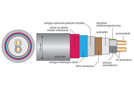 - Ekranowanie: wstęga mylarowa pokryta miedzią + miedź srebrzona + folia miedziana